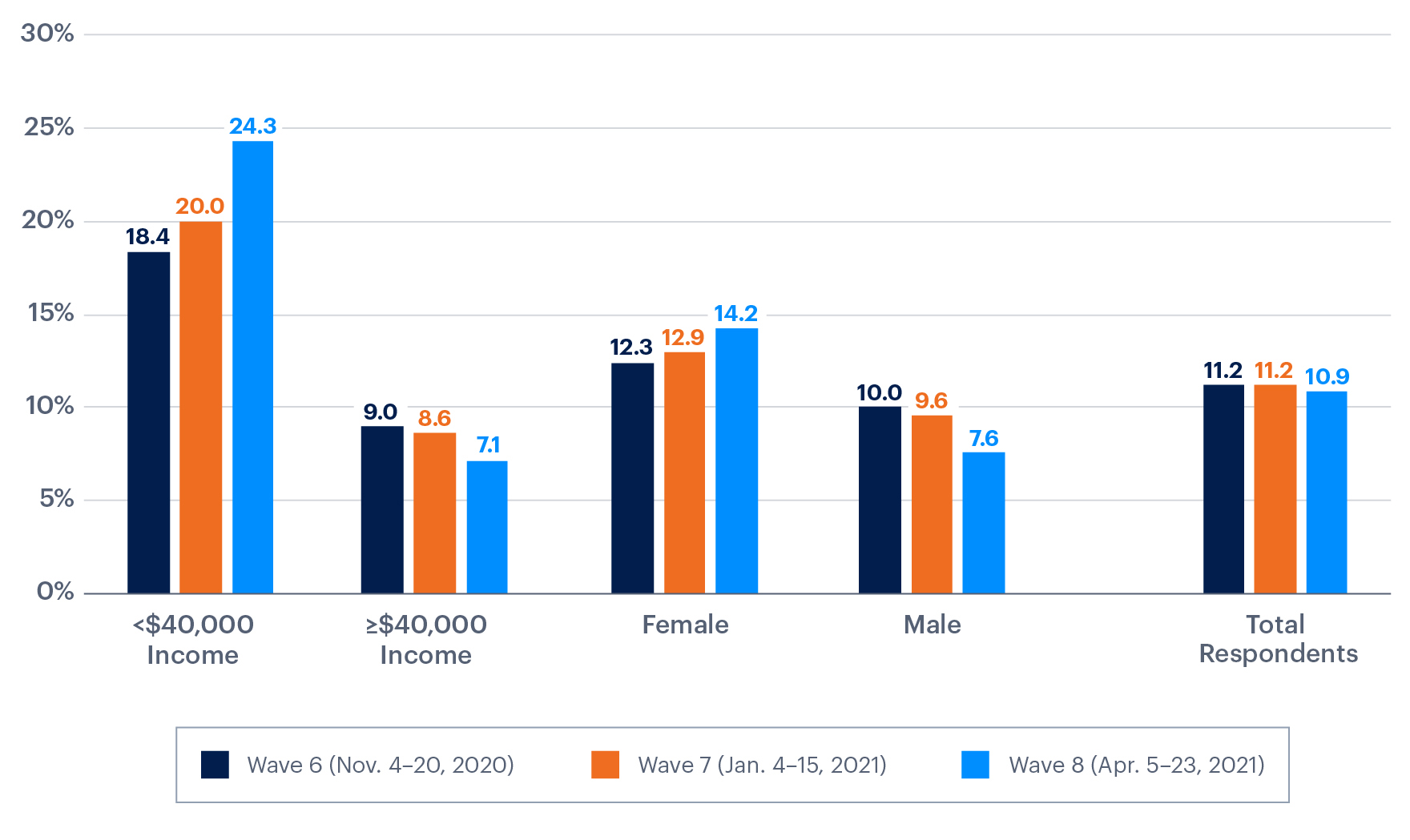 For instance, in April 2021, the percentage of respondents who reported having lost their job was 10.9 percent, relatively flat from November 2020, when reported job loss came in at 11.2 percent of respondents. But that headline number obscures real differences: Two demographic segments showed consistent increases in job loss since November 2020 ― respondents who previously earned less than $40,000 increased from 18.4 percent to 24.3 percent over that period, while female respondents increased from 12.3 percent to 14.2 percent. The remaining segments fluctuated or generally decreased over the same time frame. The upshot? Even though overall job losses were flat, that finding was driven by increasing losses in lower-income segments and decreasing losses in higher-income segments.