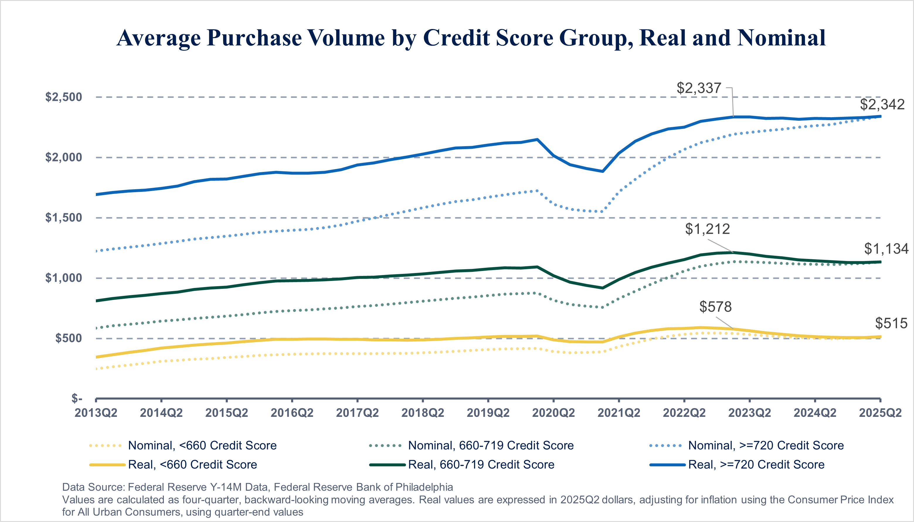 Average Purchase Volume Has Declined in Real Terms for Card Borrowers with Credit Scores Below 720