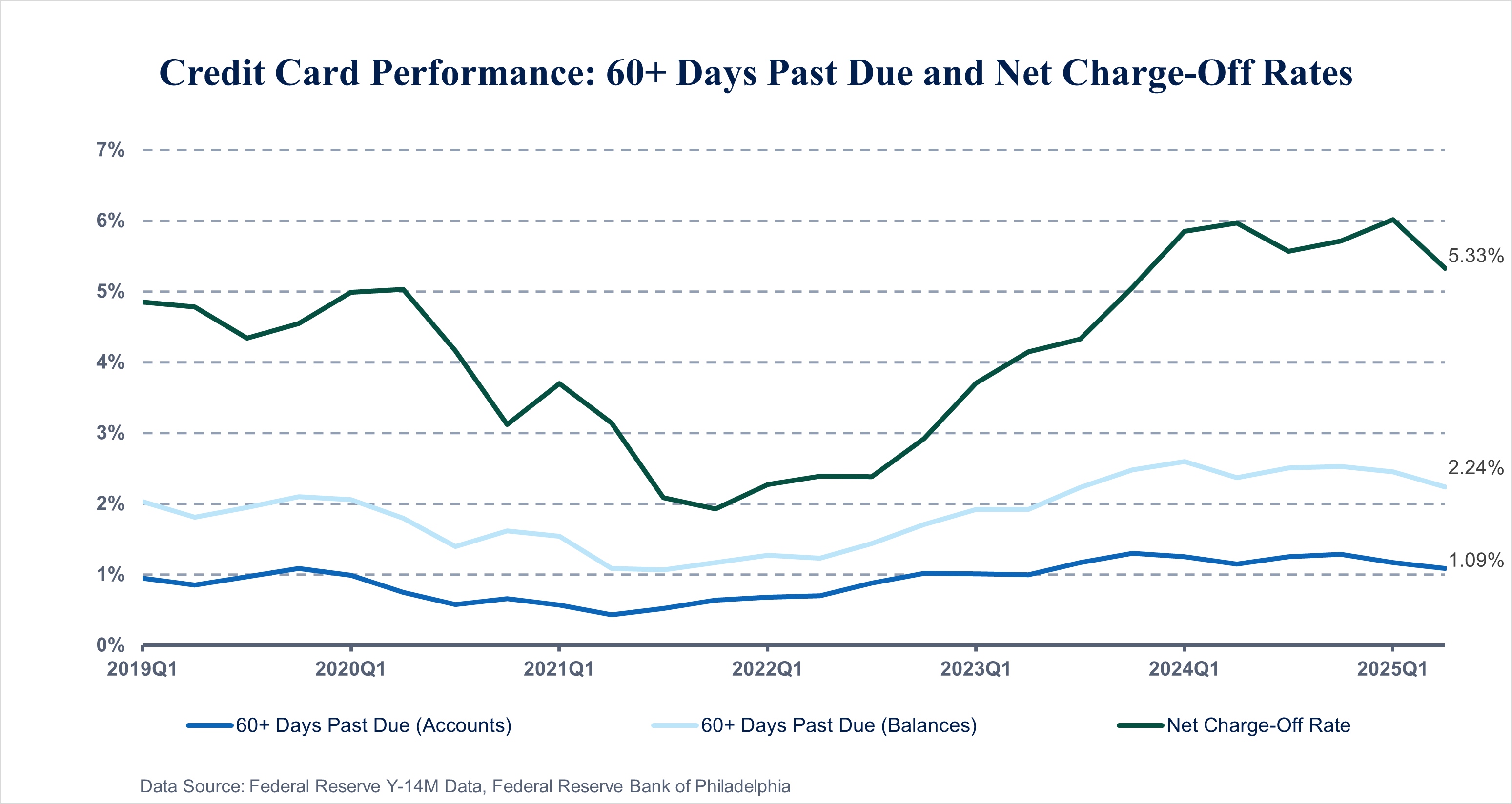 Credit card performance improved in the second quarter of 2025, as fewer accounts fell behind on payments than at the same time last year. Figure 2 shows the net charge-off rate alongside the 60 or more days-past-due rates (both accounts- and balances-based) since 2019. The performance improvements observed in the past year also hold true for the 30- and 90-days-past-due rates. This turnaround in performance could be a result of credit tightening by lenders over the past three years, which has reduced credit risk in large banks’ card portfolios, as discussed in our Q1 2025 Insights Report.