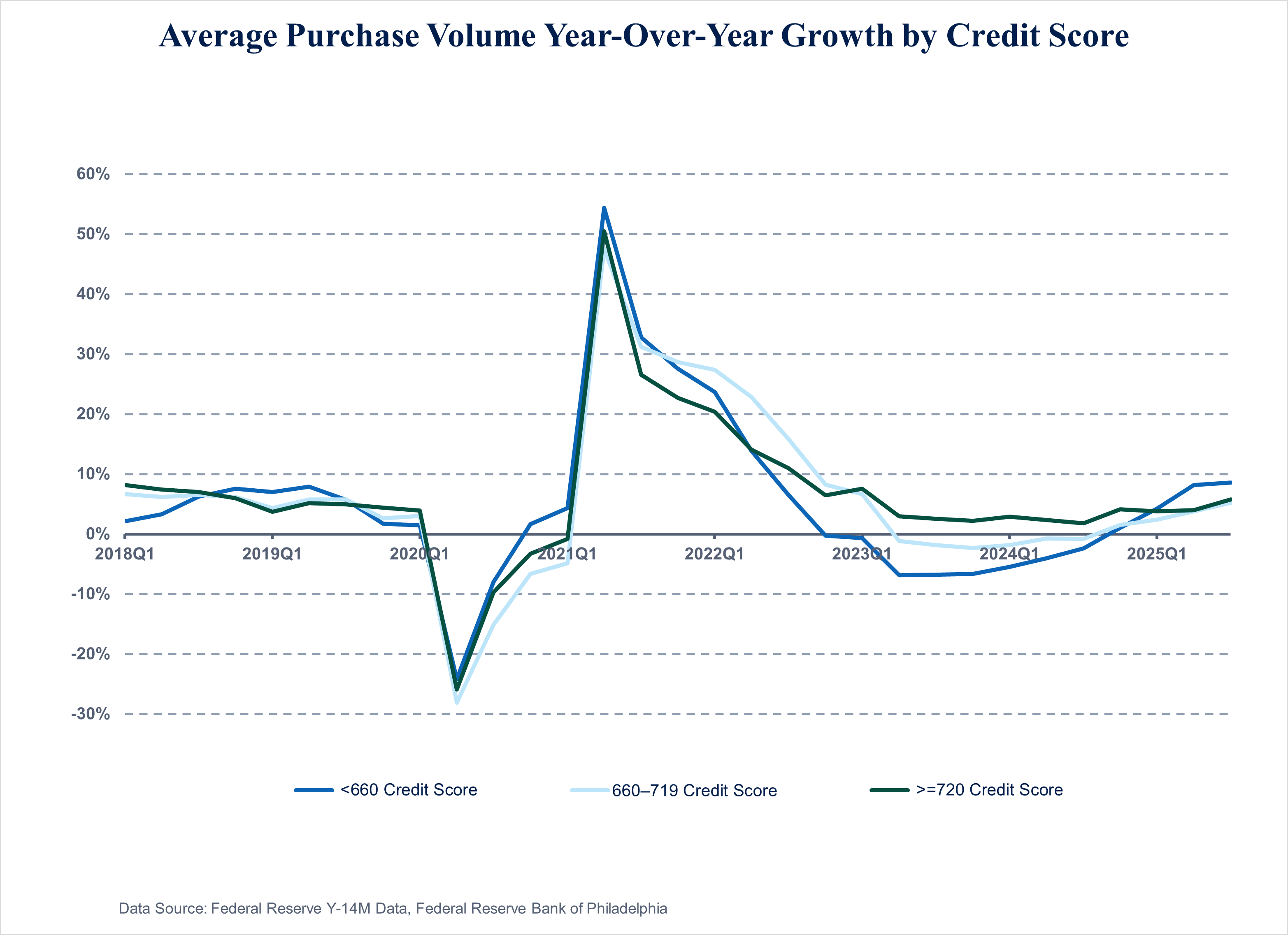 The average purchase volume per account continued to increase within all credit score bands on a year-over-year basis. Notably, although spending among the most creditworthy consumers (those with credit scores of at least 720) never contracted post-pandemic,1 borrowers with lower scores underwent a multi-quarter stretch of year-over-year declines (Figure 1).