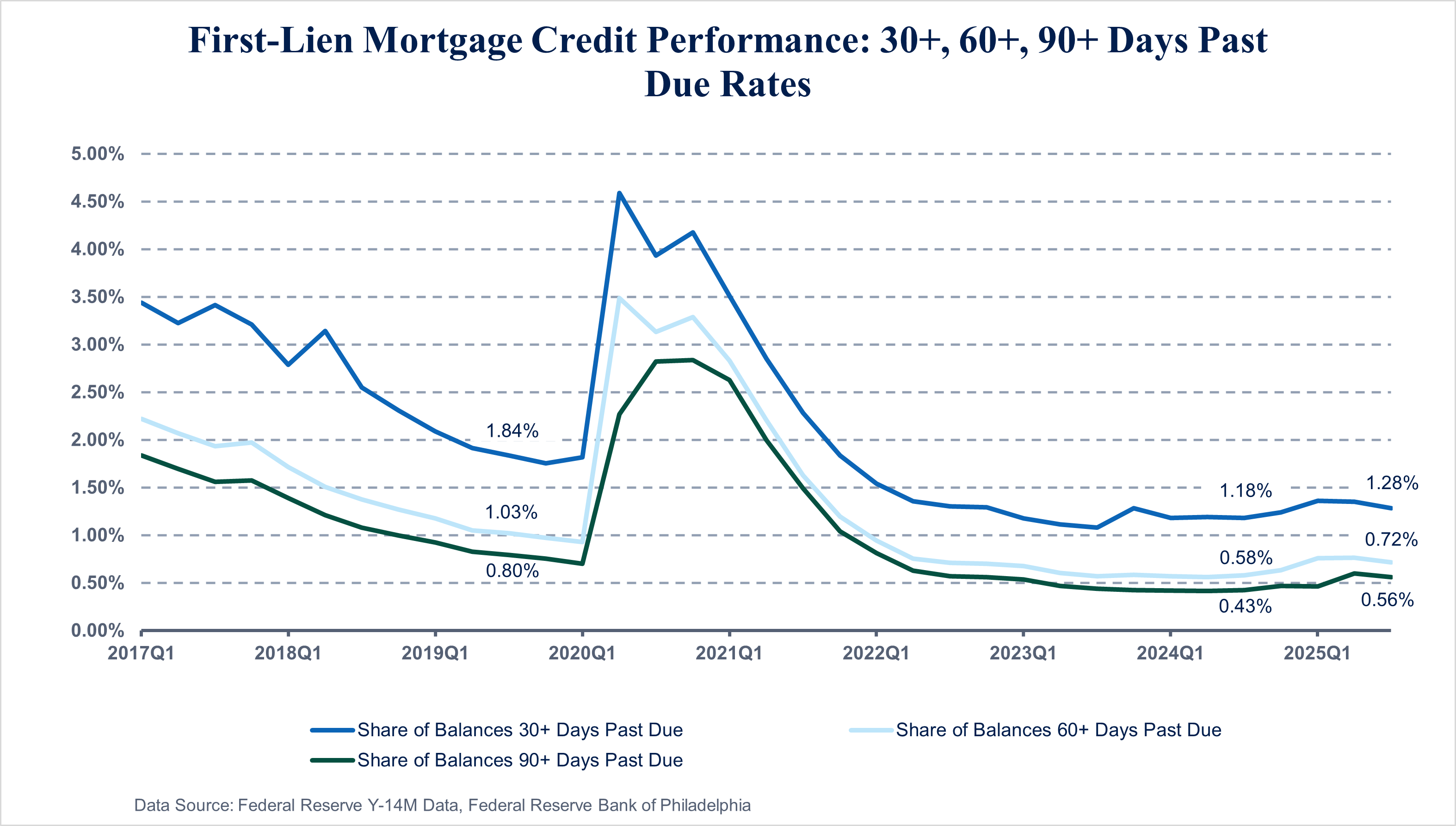 The median large bank mortgage balance has risen 15.8 percent over the past two years, or 10.0 percent when adjusting for home price growth. However, higher loan amounts do not imply that large banks’ mortgage borrowers are in danger of becoming overextended. Back-end debt-to-income ratios, which offer the most complete view of borrowers’ overall indebtedness, have remained more or less flat. Selective lending criteria and loan retention practices over an extended period have shaped a portfolio with high credit quality. For example, the 10th percentile refreshed credit score has risen more than 100 points over the past decade to 696. Furthermore, delinquency rates remain low by historical standards, as shown in Figure 3. That said, the third quarter saw the shares of balances 30+, 60+, and 90+ days past due tick up by 10, 14, and 13 basis points, respectively, compared with one year earlier, in line with similar year-over-year increases in the first and second quarters of 2025.