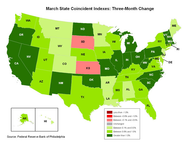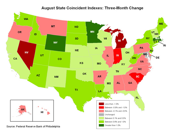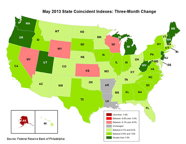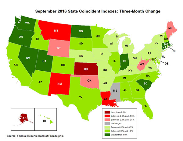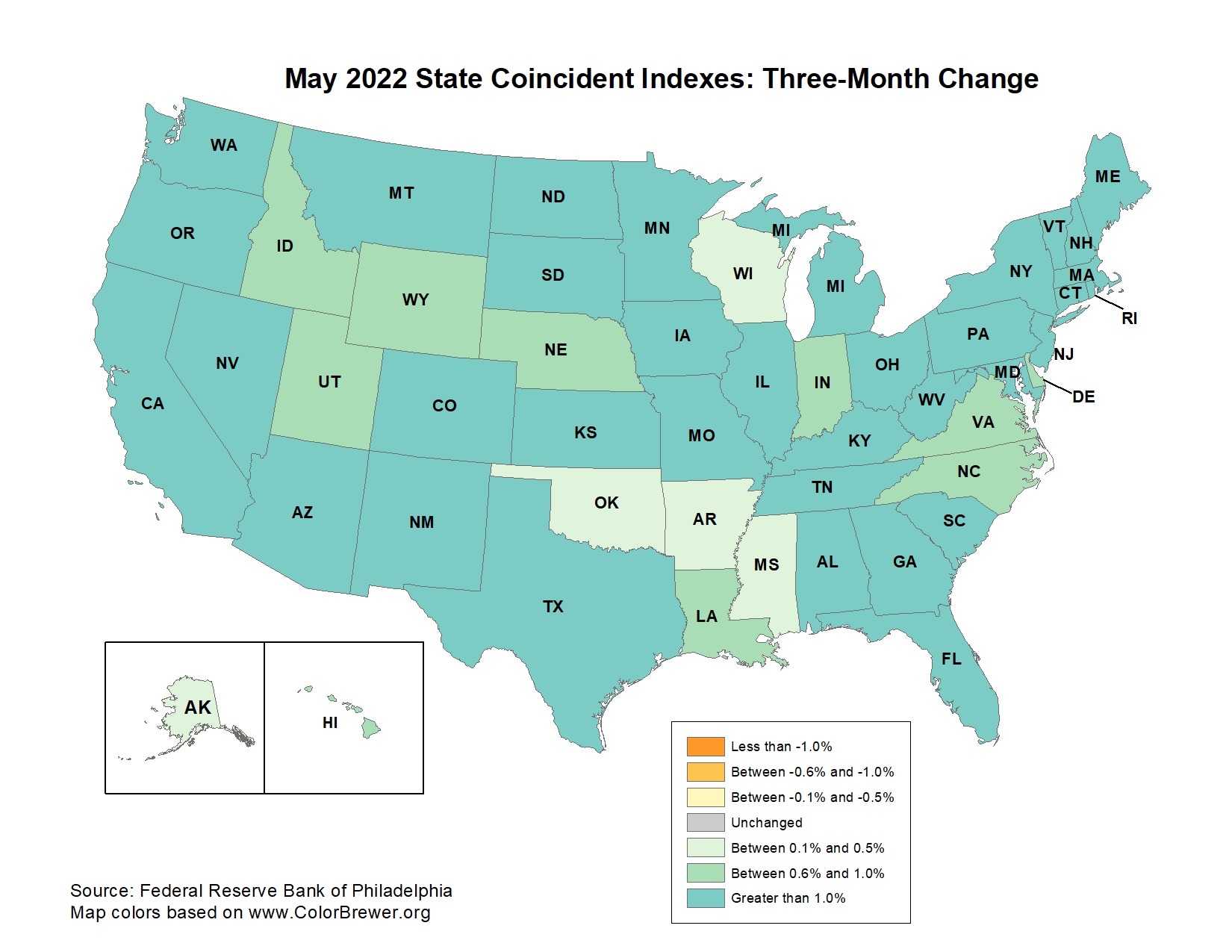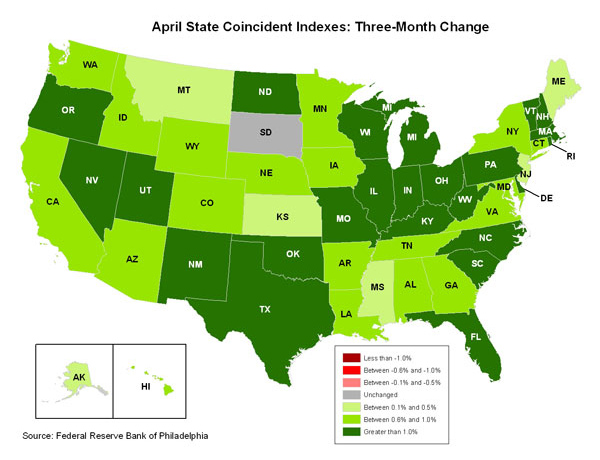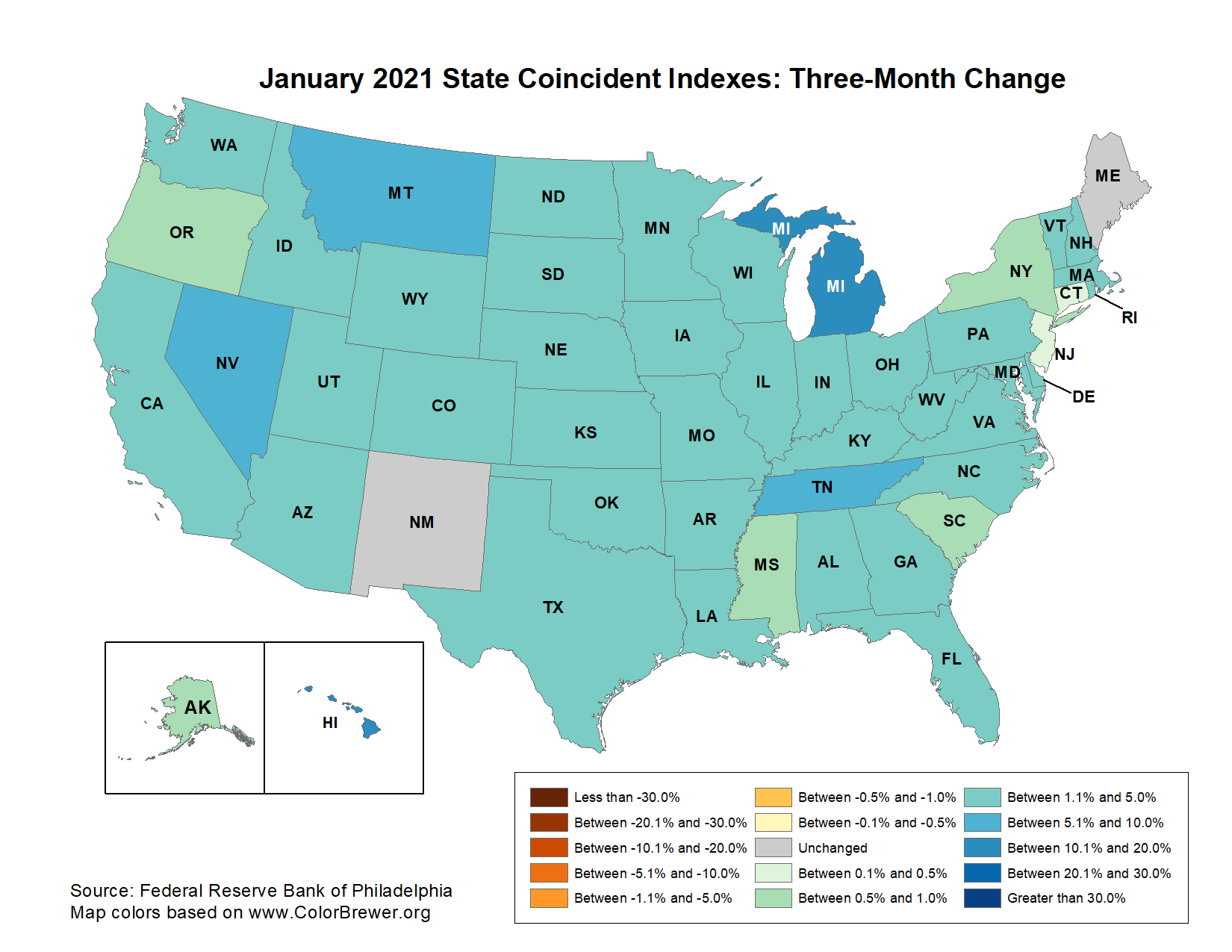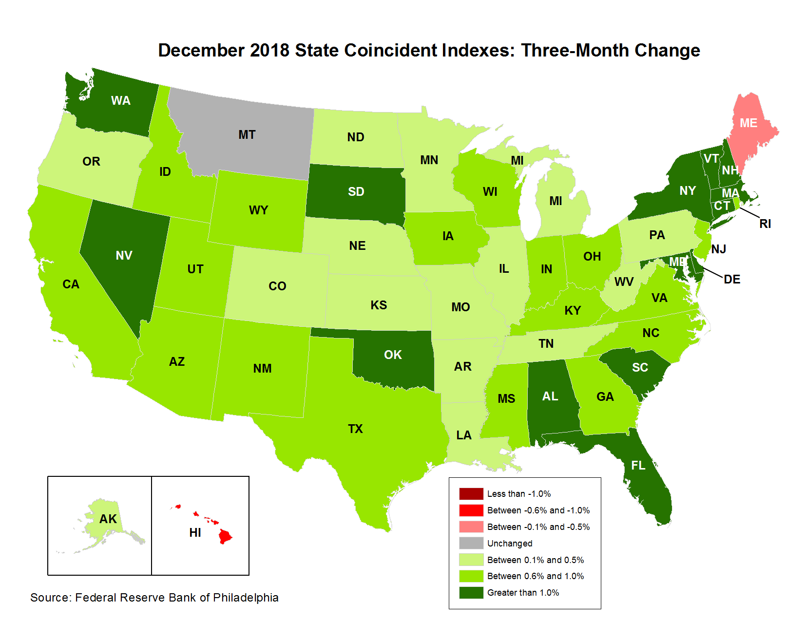 The historical maps below show the state coincident indexes from each month’s release back to January 2010. With each new release, the state coincident indexes for prior months are revised and are available in the Revised Data spreadsheet. These maps do not reflect subsequent revisions caused by methodological changes or corrections (see Changes to Methodology and Errata for more information).