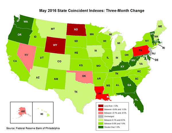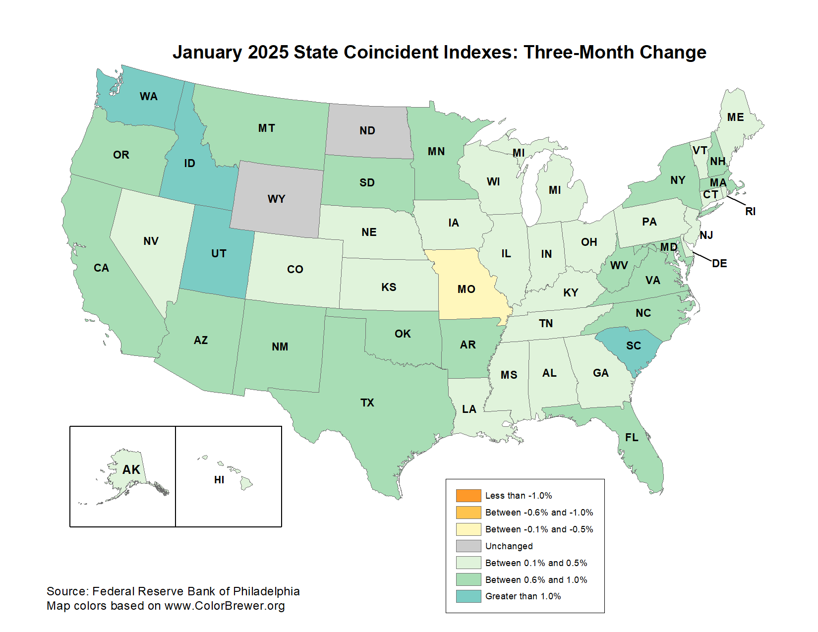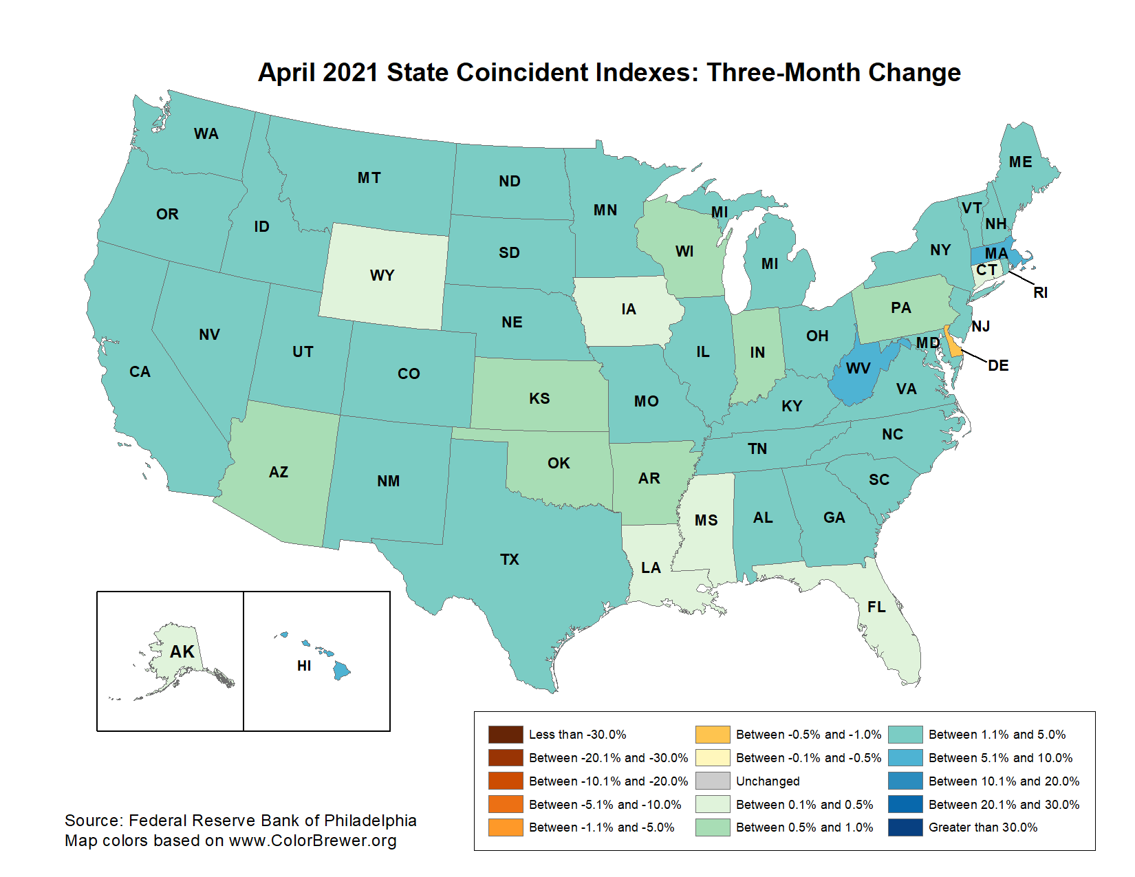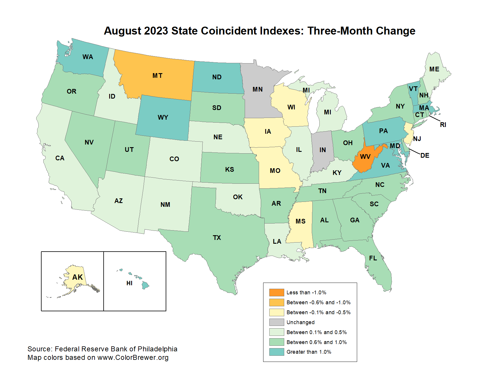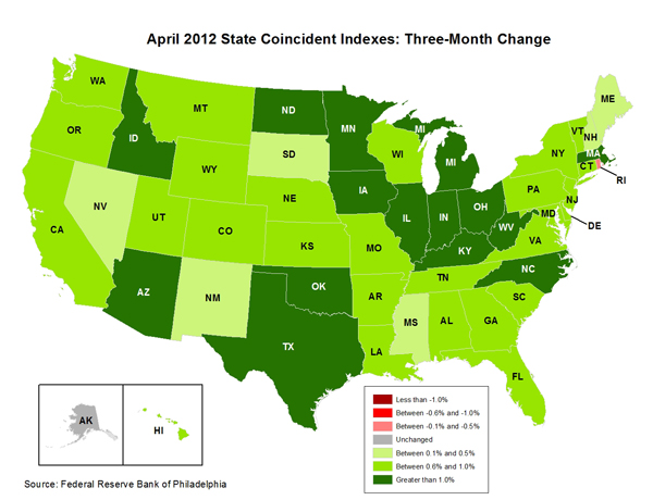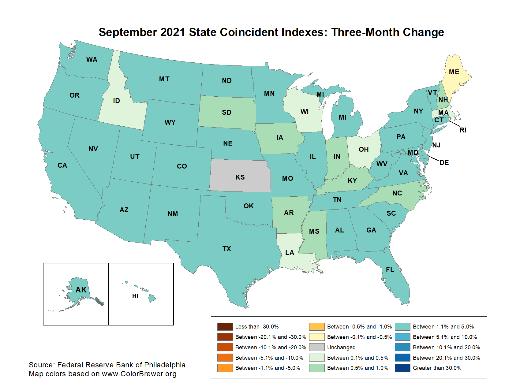 The historical maps below show the state coincident indexes from each month’s release back to January 2010. With each new release, the state coincident indexes for prior months are revised and are available in the Revised Data spreadsheet. These maps do not reflect subsequent revisions caused by methodological changes or corrections (see Changes to Methodology and Errata for more information).