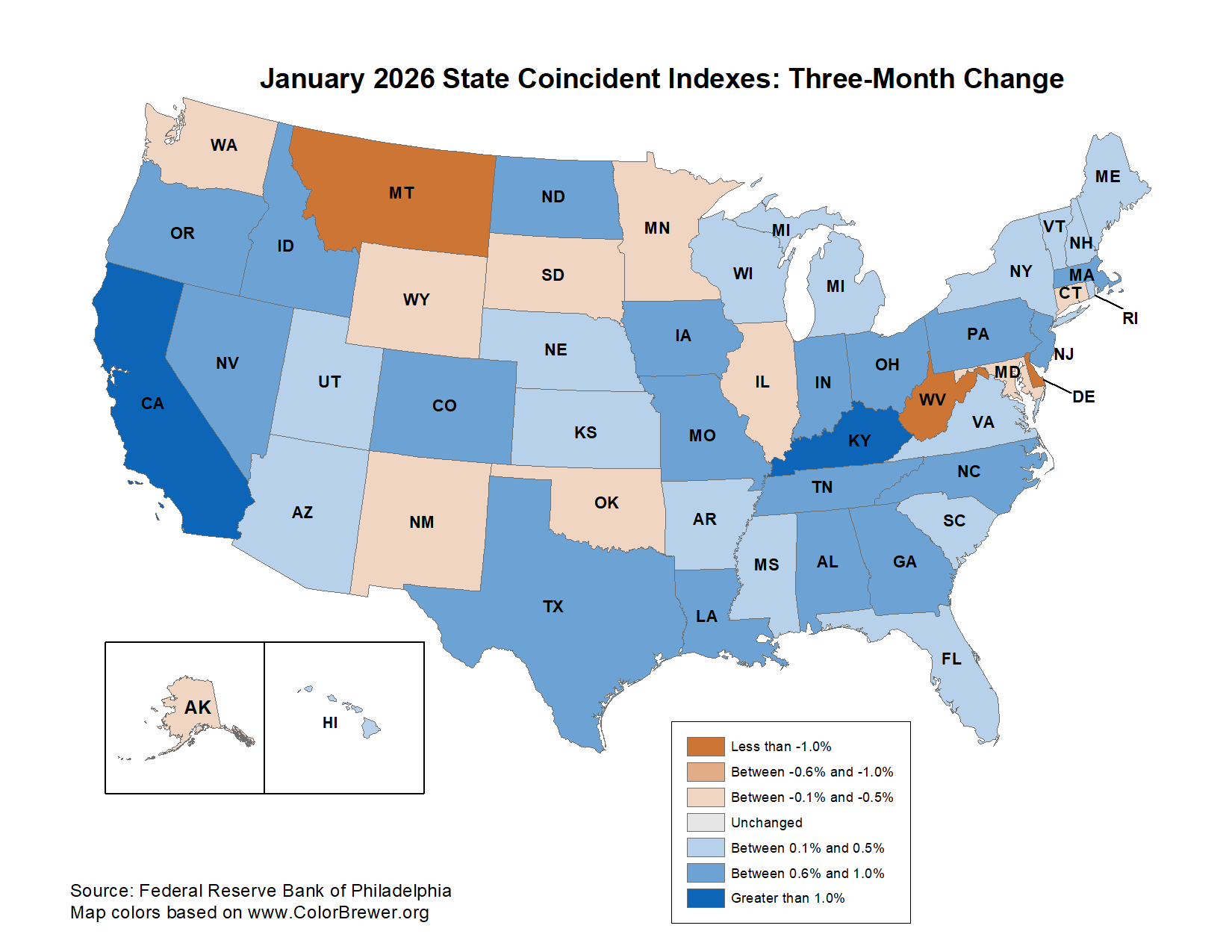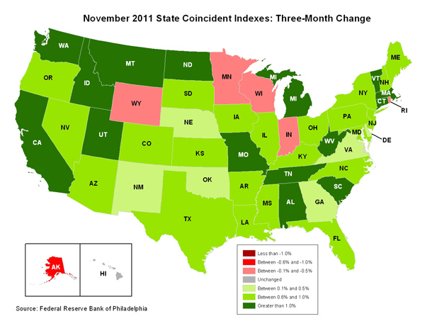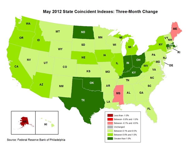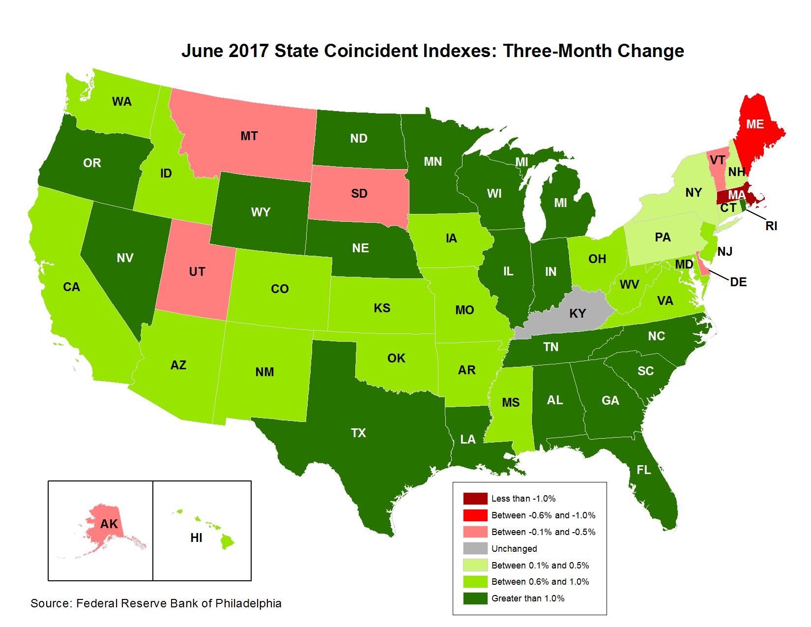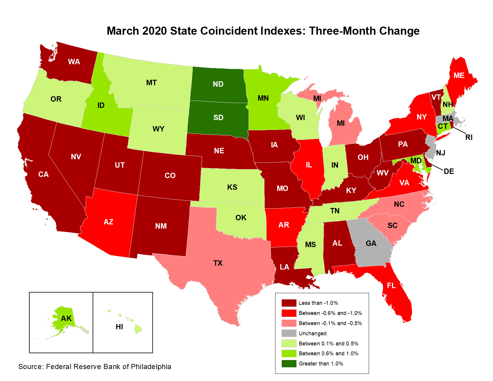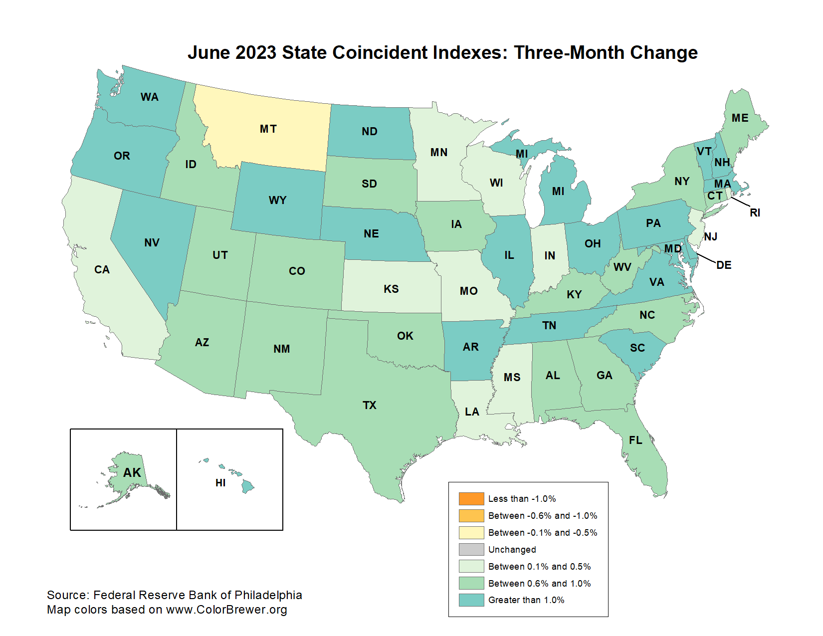 The historical maps below show the state coincident indexes from each month’s release back to January 2010. With each new release, the state coincident indexes for prior months are revised and are available in the Revised Data spreadsheet. These maps do not reflect subsequent revisions caused by methodological changes or corrections (see Changes to Methodology and Errata for more information).