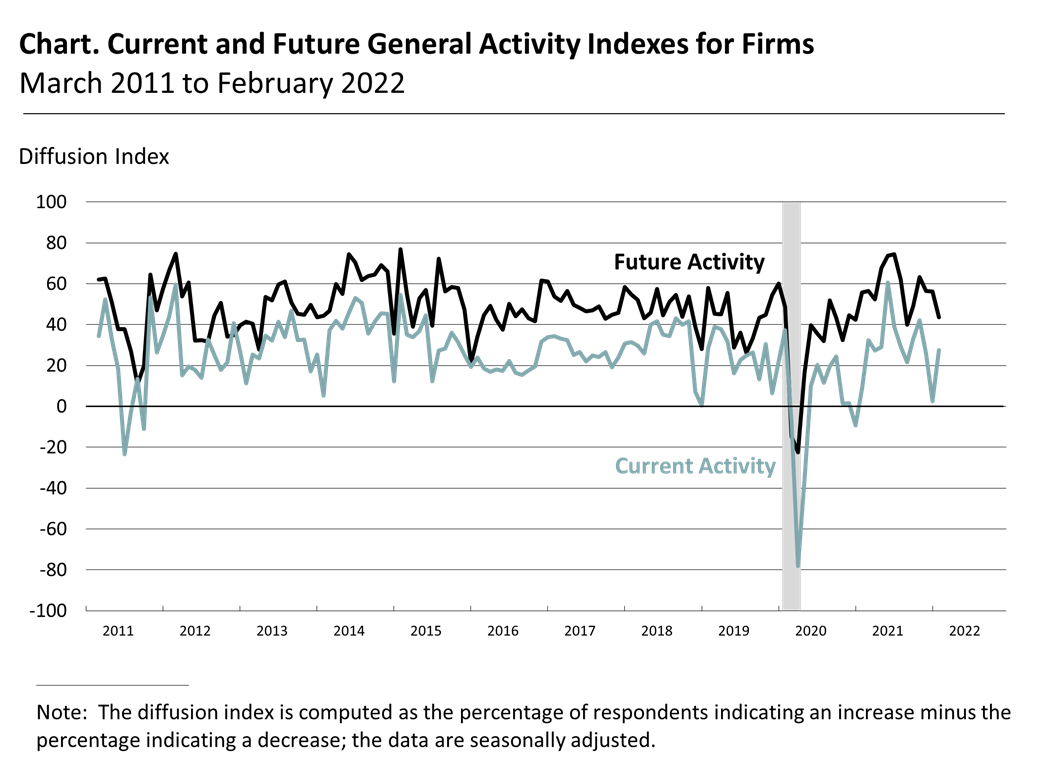 Price indicator readings suggest widespread increases in prices for inputs and the firms’ own goods and services, and both indexes reached new all-time highs this month. The prices paid index increased 6 points to 68.8 in February. Most respondents (70 percent) reported increases in input prices, while only 1 percent of the firms reported decreases; 20 percent reported stable prices. Regarding prices for the firms’ own goods and services, the prices received index rose 6 points to 43.8 this month. More than 45 percent of the firms reported higher prices, 2 percent reported lower prices, and 36 percent reported no change.