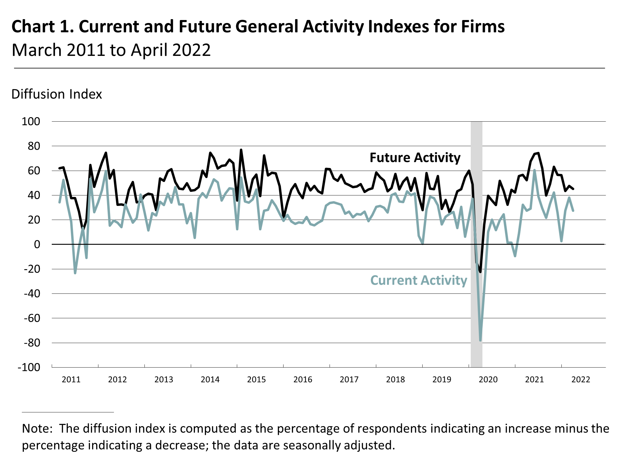 Both future activity indexes declined but continue to suggest that firms anticipate growth over the next six months. The diffusion index for future activity at the firm level edged down from a reading of 47.7 in March to 45.1 this month (see Chart 1). Nearly 59 percent of the respondents expect an increase in activity at their firms over the next six months, compared with 14 percent that expect decreases and 24 percent that expect no change. The future regional activity index decreased 4 points to 34.4.