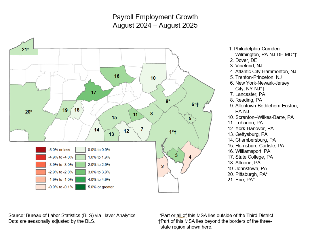 The charts below provide snapshots of economic data for Delaware, New Jersey, and Pennsylvania and tri-state metropolitan statistical areas (MSAs), including payroll employment growth, unemployment rates, housing permits, and house prices. For statewide summaries, see the Tri-State Tracking reports. To download data for states and MSAs, see Third District Historical Data.