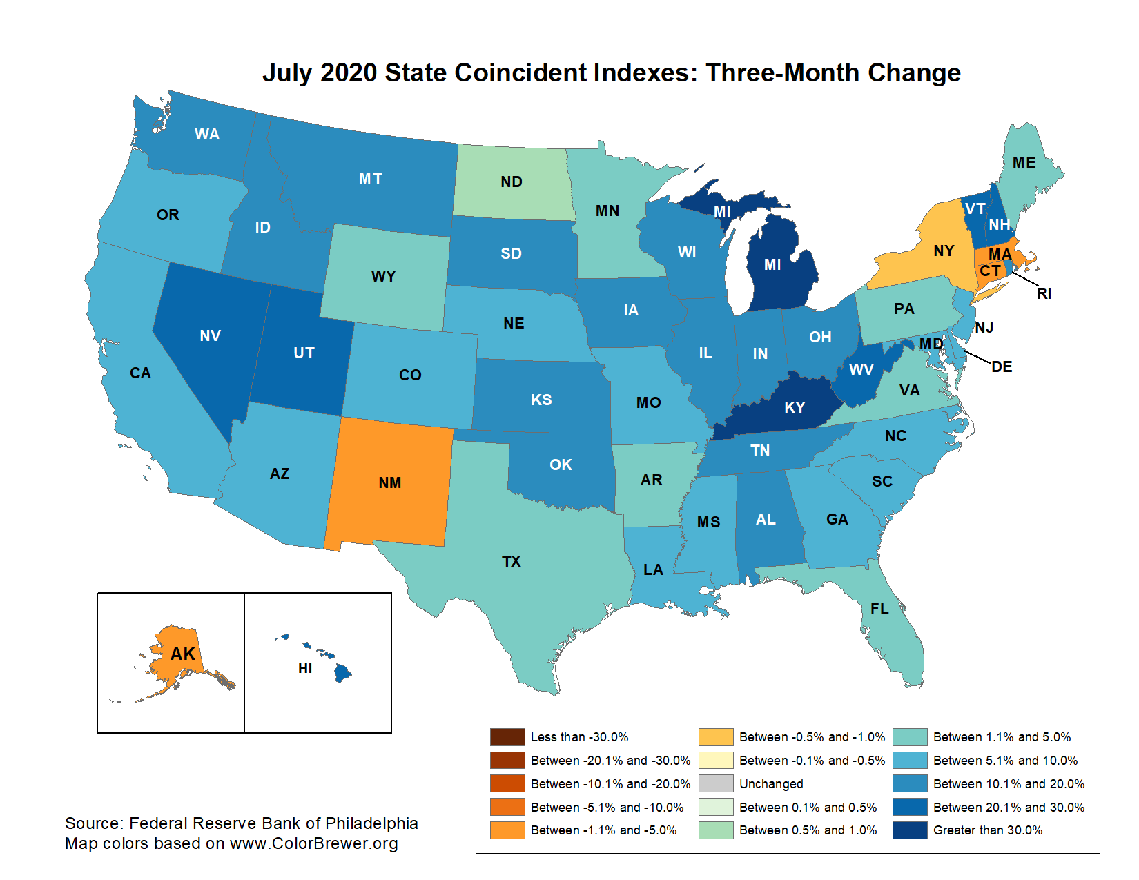 Over the past three months, the indexes increased in 45 states and decreased in five states, for a three-month diffusion index of 80. Additionally, in the past month, the indexes increased in 37 states, decreased in 11 states, and remained stable in two, for a one-month diffusion index of 52.