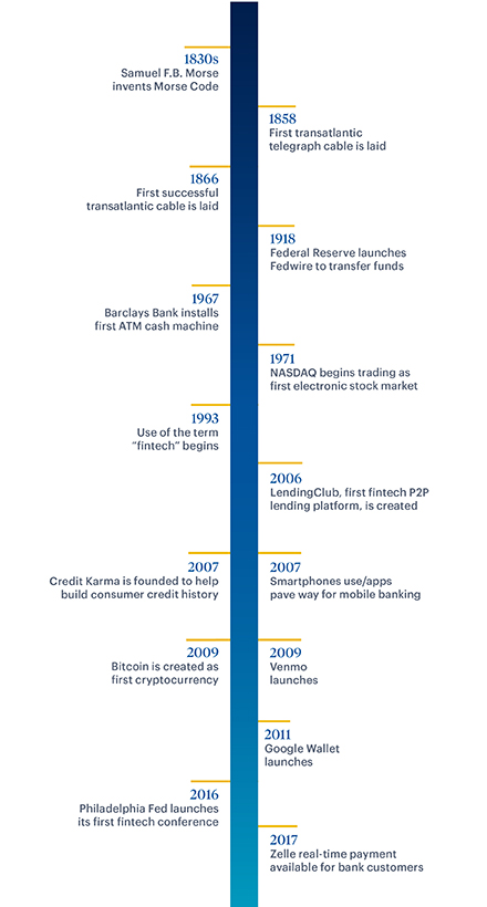 - Timeline comprises data from “The Evolution of Fintech: A New Post-Crisis Paradigm,“ by R. Buckley, D. W. Arner, and J. N. Barberis (January 2016); “Fintech: The History and Future of Financial Technology,” The Payments Association (October 2020), and additional research by Philadelphia Fed staff.
